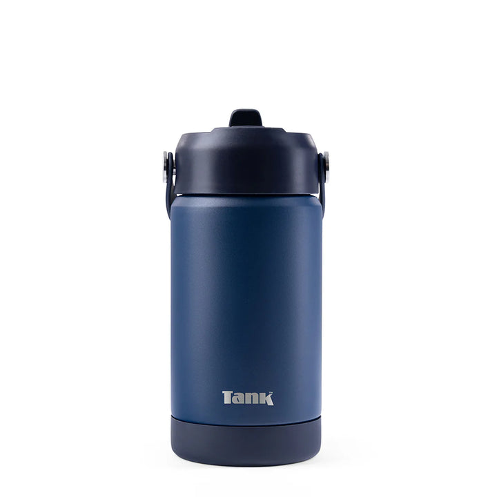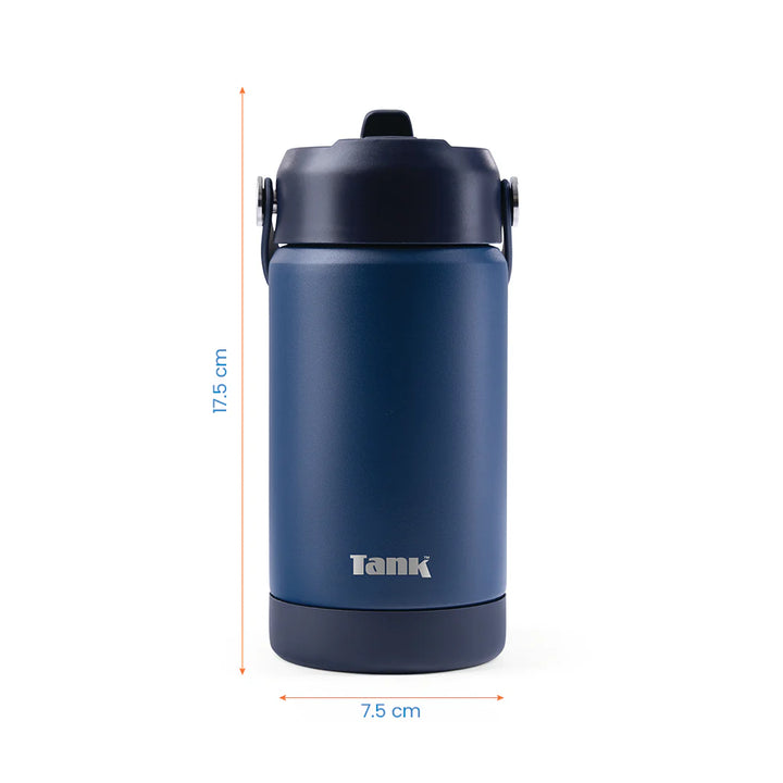 زجاجة مياه تانك ستانلس بسعة 350 مللي باللون الكحلي، تصميم صغير عملي مثالي للحمل اليومي، مع قدرة ممتازة على الحفاظ على برودة المشروبات لفترات طويلة. مناسبة للاستخدام في المكتب، الجيم، المدرسة أو أثناء التنقل.