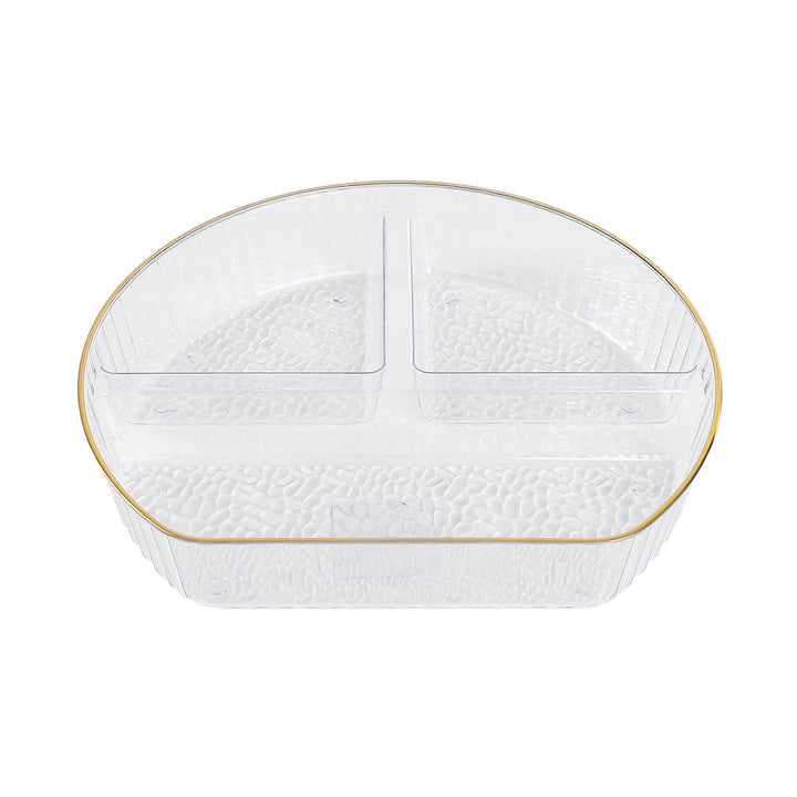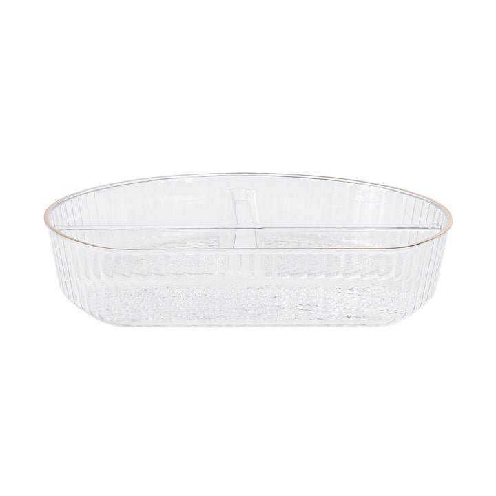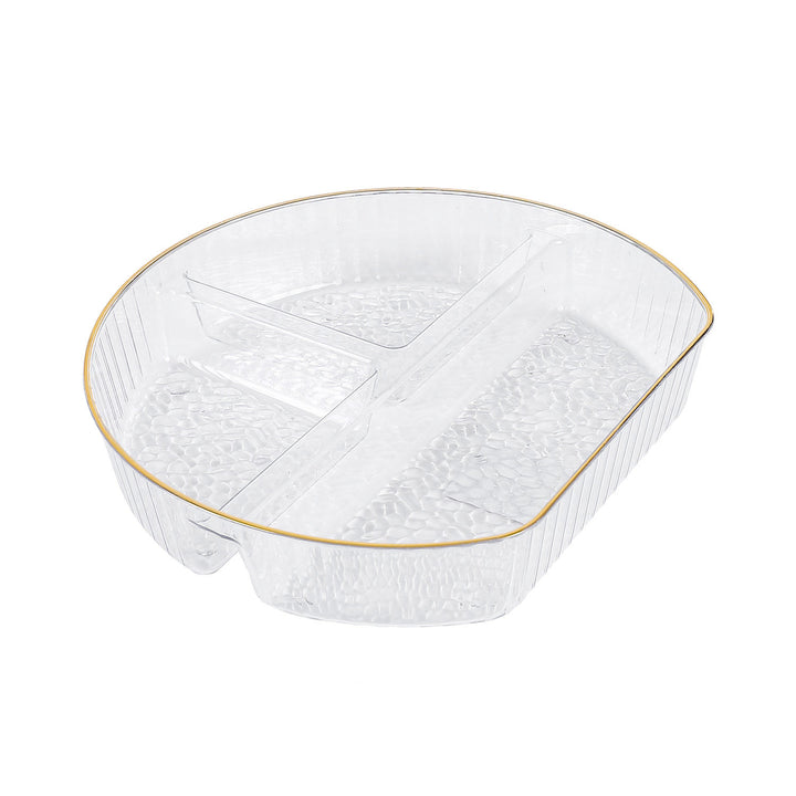 طبق تسالي بلاستيك نصف دايرة بإطار ذهبي 3 عين موديل 16123، تصميم أنيق وعصري مثالي لتقديم التسالي والمقبلات بأناقة وجودة عالية في جميع المناسبات.