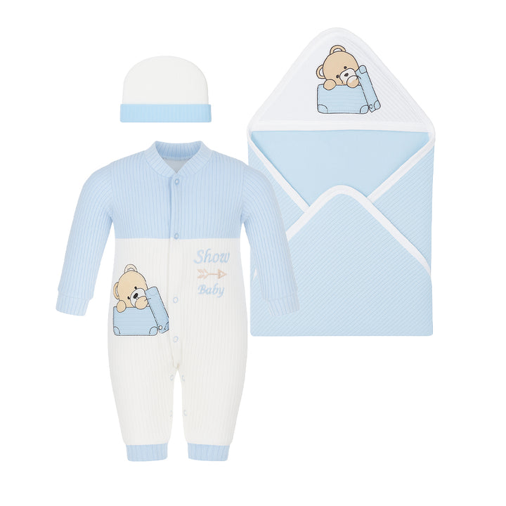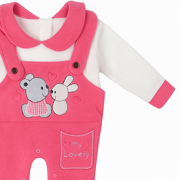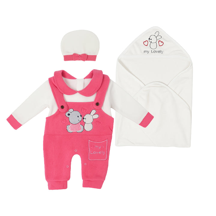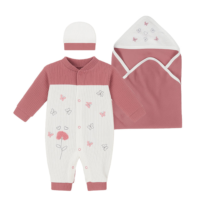 ● The set consists of 3 pieces: an elegant jumpsuit decorated with elegant floral and heart patterns, an elegant hat to add elegance and warmth to the baby, and a baby bonnet for additional protection and warmth for your baby.