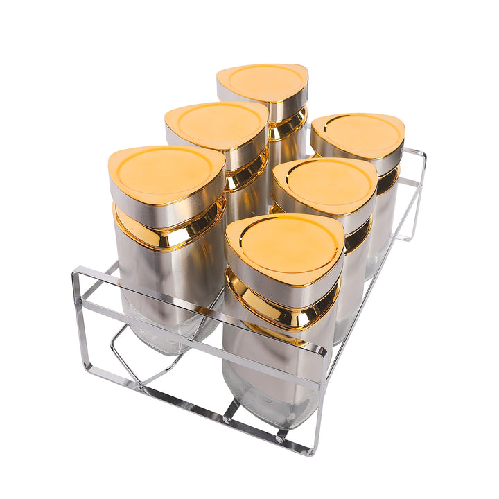 طقم توابل أنيق ومتكامل من 7 قطع مصنوع من الزجاج الشفاف مع أغطية من الستانلس ستيل، يأتي مزوّدًا بحامل منظم يسهل وضعه على سطح المطبخ. يتميز بتصميم عصري وعملي يساعد في ترتيب التوابل وإبقائها في متناول اليد، كما يضفي لمسة جمالية على مساحة المطبخ.