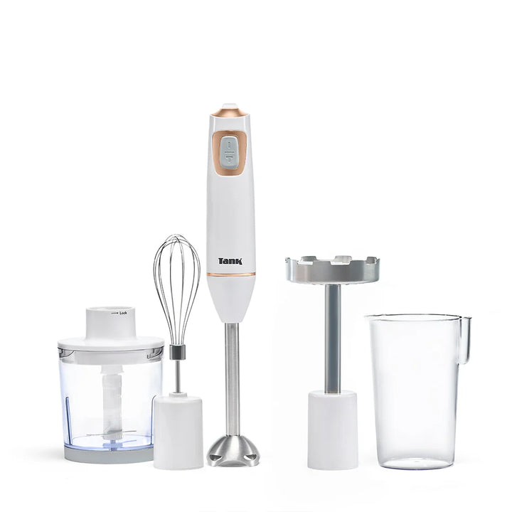 هاند بلندر تانك CM-6003-1 متعدد الوظائف بقوة 600 وات باللون الأبيض×روز جولد، يأتي مع مجموعة متكاملة من الملحقات لتلبية جميع احتياجات المطبخ. مزود بمحرك DC متين بملف نحاسي وشفرات متقدمة SS304 لتوفير أداء خلط سريع وفعال، مع تصميم عملي ومريح يسهل التعامل مع المكونات المختلفة مثل العصائر، الصلصات، البطاطس المهروسة والمزيد.