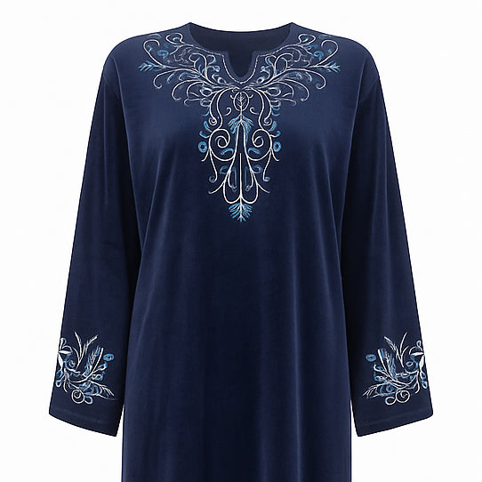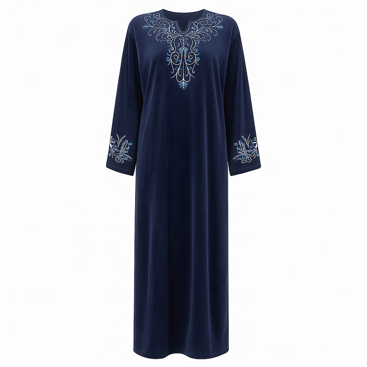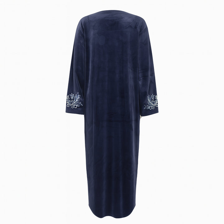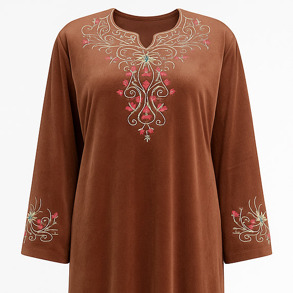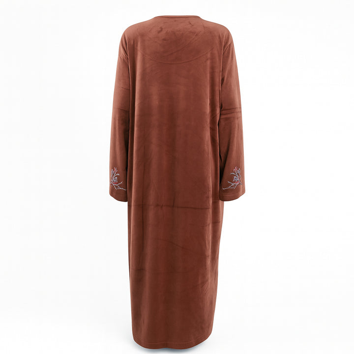 جلابية حريمي شتوي قطيفة ريجينا موديل 509 بخامة ناعمة وتصميم خاص يناسب المقاسات الكبيرة 3XL إلى 4XL، تمنحك دفء وأناقة للمنزل.