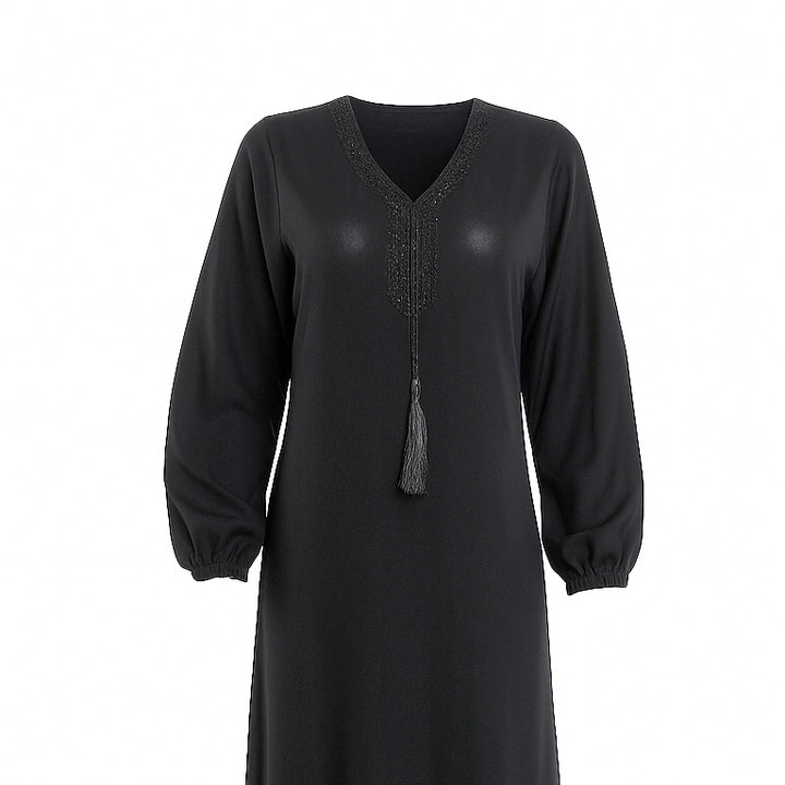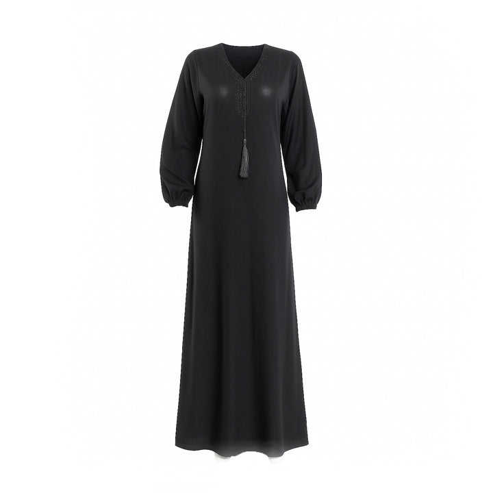 جلابية حريمي صيفي من كيوتا موديل 2015، كم عادي ولون أسود، خامة مريحة وخفيفة، متوفرة من L إلى 2XL. مثالية للراحة والأناقة اليومية.