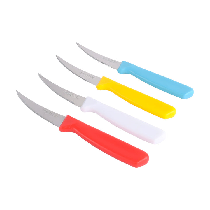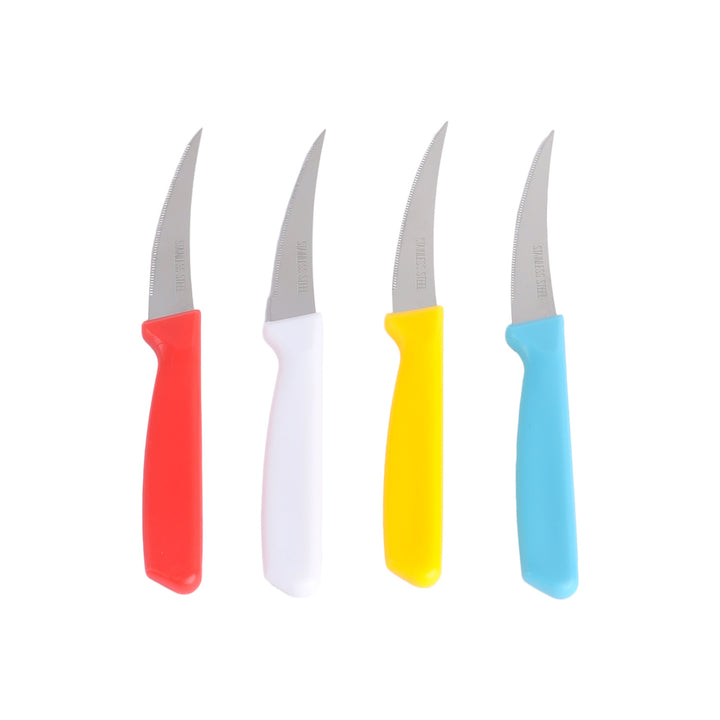 طقم سكاكين 4 قطع بألوان متعددة على كارت، شفرات حادة ومقابض مريحة، تصميم عملي وملون لمطبخك.