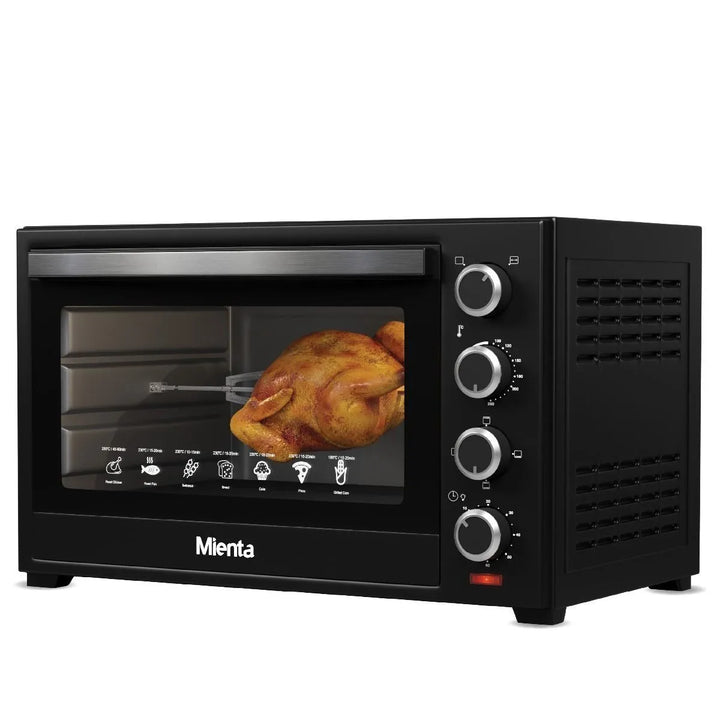 فرن ميانتا الكهربائي 60 لتر موديل OV301138A بقدرة 2000 وات، مروحة حرارية، شواية، مؤقت 60 دقيقة، وتحكم دقيق في الحرارة حتى 250 درجة، تصميم أسود أنيق وسعة مثالية للطهي اليومي.