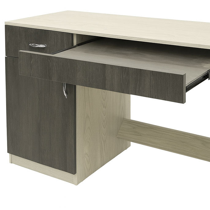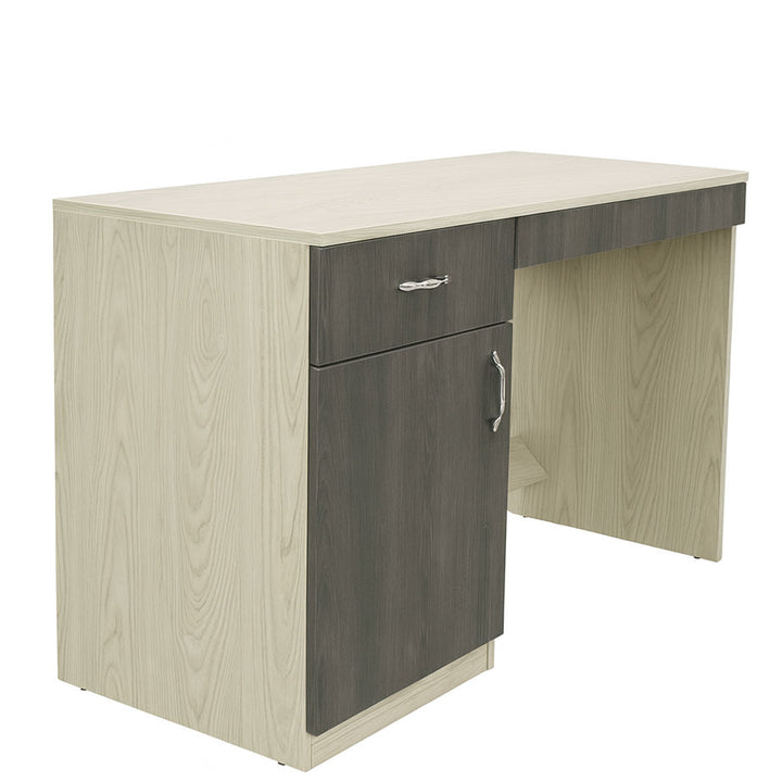 وحدة تخزين مغلقة (برج): يحتوي على وحدة جانبية متكاملة تتضمن دُرج علوي واسع لتخزين المستلزمات الصغيرة وخزانة سفلية بباب لتخزين الأجهزة أو الملفات الكبيرة.
