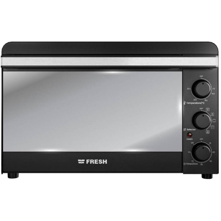 فرن فريش كامل 48 أسود FR-4804RCL، كهربائي بقدرة 2000 واط، مع 5 وظائف للطهي، مروحة لتوزيع الحرارة، مؤقت 90 دقيقة، إضاءة داخلية، موتور شواية، وعناصر تسخين من الستانلس ستيل المقاوم للصدأ، مع تصميم عصري موفر للطاقة.
