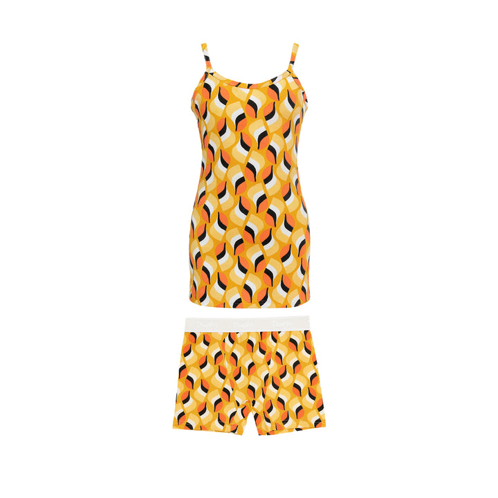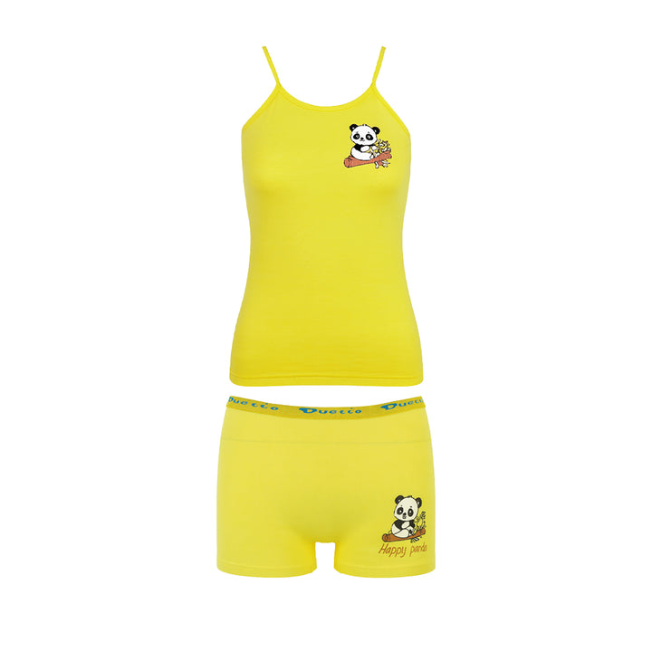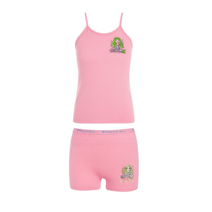 طقم بناتي بتصميم عصري وجذاب يناسب البنات من عمر 6 إلى 14 سنة. يتميز بحمالة رفيعة مطبوعة بنقشات كيوت تزيد من جاذبية الطقم، مع خامة ناعمة مريحة تناسب الاستخدام اليومي وخاصةً في الأجواء الدافئة.