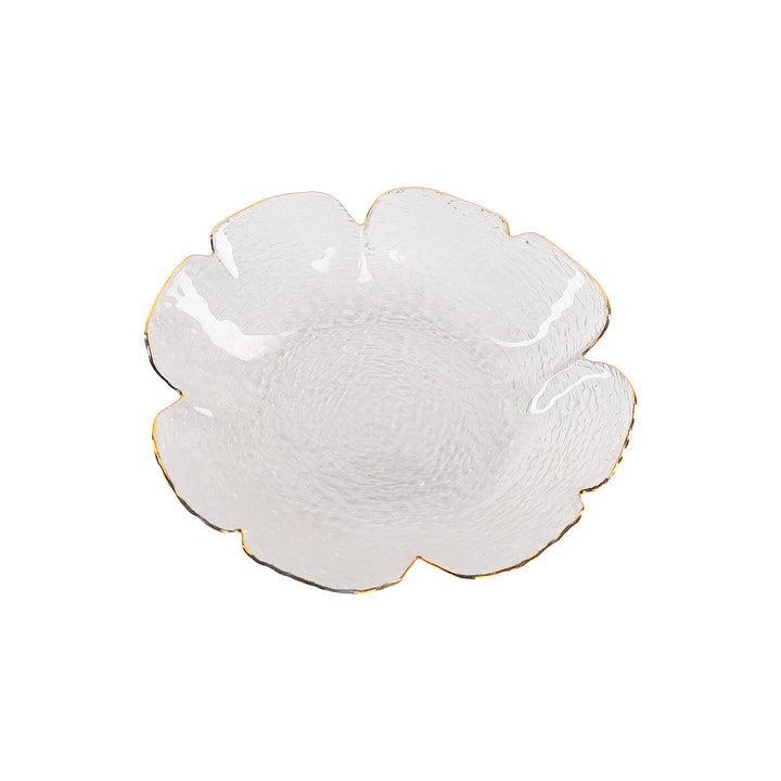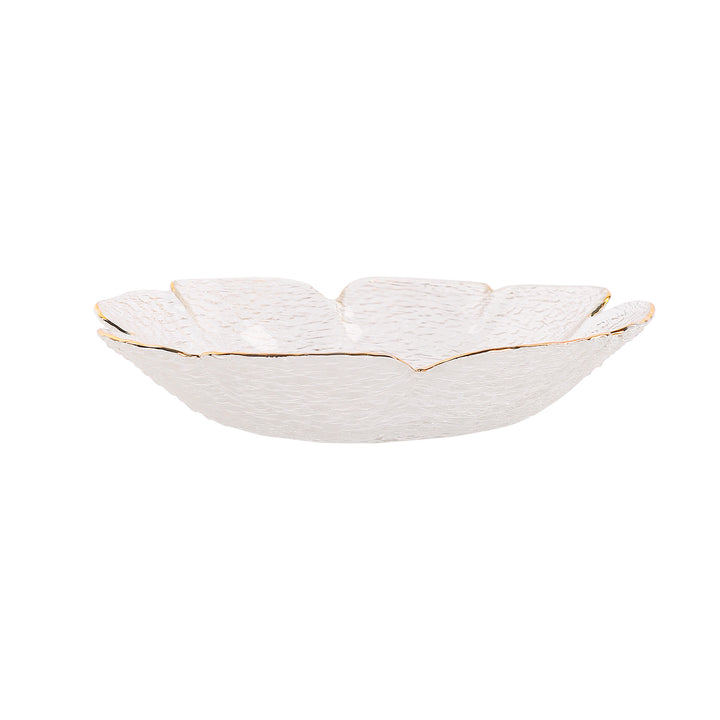 طبق زجاج أنيق مزين بحرف ذهبي على شكل وردة، يضفي لمسة فخمة ورقي على طاولة الطعام أو أماكن التقديم. تصميمه الفني يجعله مثاليًا لتقديم الحلويات، المكسرات، أو حتى كقطعة ديكور مميزة.