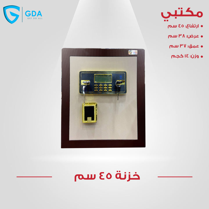 خزينة أموال مكتبية GDA مقاس 45 سم توفر لك مستوى متقدم من الأمان لمقتنياتك الثمينة داخل بيئة العمل أو المنزل. تتميز بحجم متوسط مثالي للتخزين، وهي مصنوعة من خامات معدنية قوية، مزودة بقفل إلكتروني رقمي دقيق مع مفاتيح طوارئ للفتح اليدوي. مثالية لحفظ الأموال، المستندات، الأجهزة، والمجوهرات.