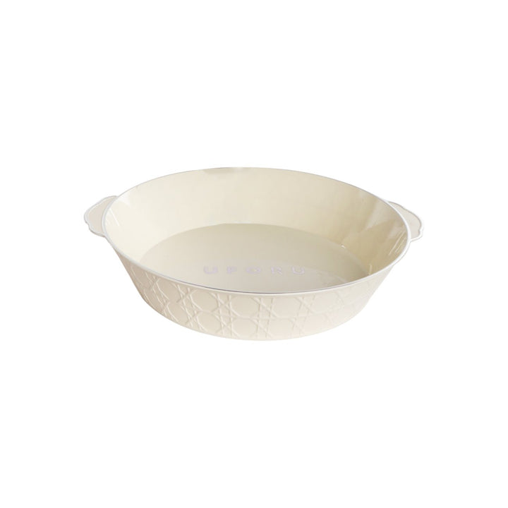 ● تصميم بيد مدور: يتميز الطبق بوجود يدين مدورتين على الجانبين، مما يسهل حمله وتحريكه بسهولة، ويضمن لك راحة إضافية أثناء استخدامه سواء كان في المطبخ أو على الطاولة