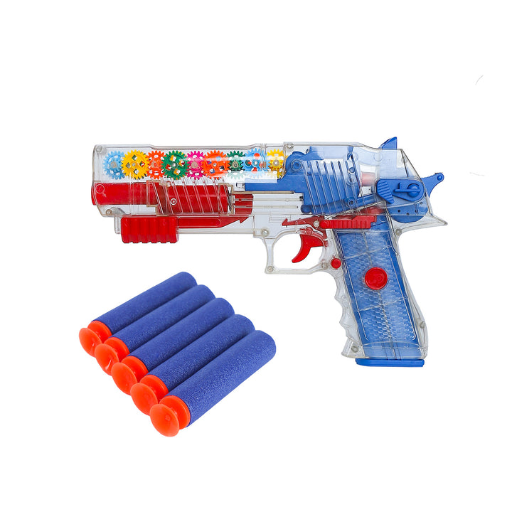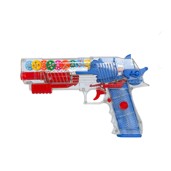 لعبة مسدس شفاف بتصميم عصري ومميز، موديل JD133-49A، تجمع بين المتعة والتشويق، مع رؤية واضحة لمكونات التروس الداخلية التي تزيد من تفاعل الطفل مع اللعبة.