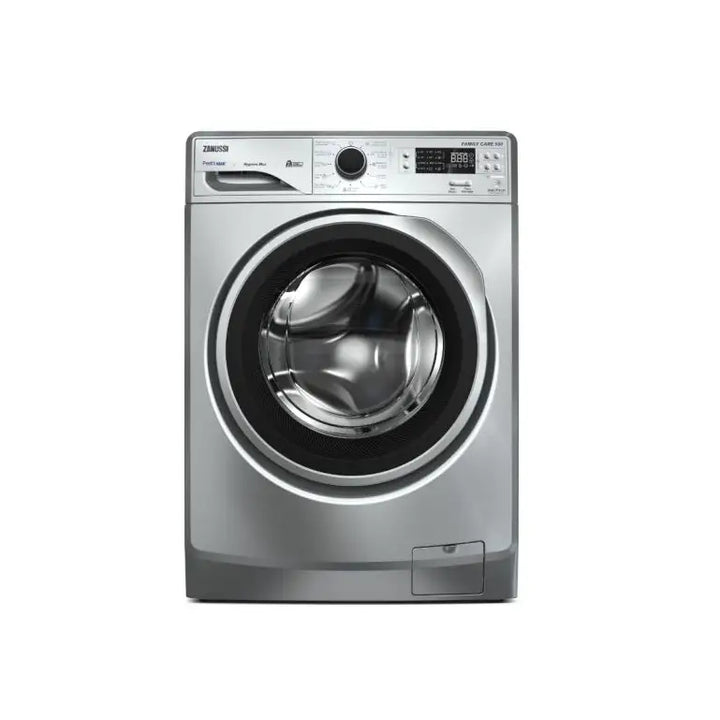 غسالة زانوسي تحميل أمامي 7 كجم، 1200 لفة، تقنية PERLAMAX مع بخار لتعقيم الملابس، إضافة ملابس أثناء الغسيل، وتقليل التجاعيد، تصميم فضي عصري.