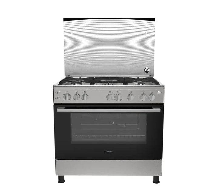 بوتاجاز زانوسي 90 سم 5 شعلة موديل ZCG91236XB ستانلس ستيل، مزود بإشعال ذاتي، مروحة فرن وشواية، حوامل شبكية حديد الزهر، أمان كامل وضمان 5 سنوات.